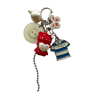 1 keychain- silver lobster clasp, deadstock blue & white polo silver charm, white & pink butterfly charm, white plastic pearl charm, vintage plastic clear button, deadstock red & white hello kitty charm "kitty love", silver drop chain